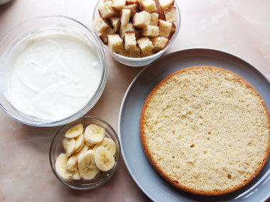 Затем уложите слой бананов. Продолжайте собирать конусовидную башенку в такой очередности: слой кусочков бисквита в сметанном креме, затем слой нарезанных бананов.