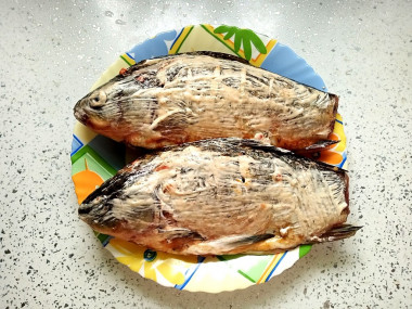 У меня было два крупных почищенных карася. Хорошо промыла их, обсушила и посолила. Затем посыпала их сушеными овощами и смазала майонезом.