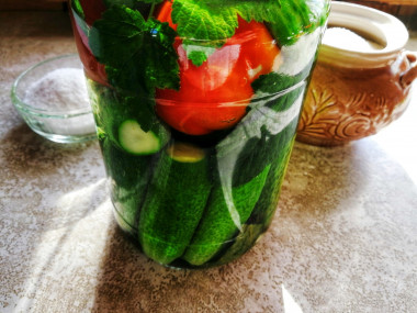 4. Далее срезать кончик огурцов и плотно уложить их в банку. Между плодами огурцов можно еще положить немного веточек сельдерея. Плодоножки помидоров проколоть с помощью зубочистки, не до конца - где-то до середины плода. Это нужно, чтобы томаты хорошо просолились и не лопнули при заливке их кипятком. Уложить помидоры сверху огурцов в ту же банку. Поверх помидоров также положить зелень и половинку стручкового перца.