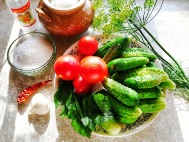 1. Помыть помидоры и огурцы под проточной водой. Зелень также промыть от грязи и пыли, затем залить водой на 20-30 минут, слить воду и обсушить. Чеснок очистить от шелухи, с корня хрена также снять кожицу. Промыть водой. Чеснок разобрать на дольки и разрезать его пополам. Горький стручковый перец также промыть и отрезать плодоножку.