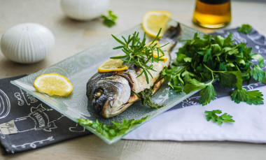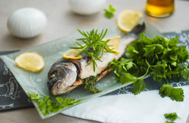 Дорада - очень вкусная рыба, просто само совершенство! По этому рецепту получилась просто замечательной и на вид, и на вкус. Когда я запекаю рыбу, в брюшко ложу обычно веточки укропа. Но, как оказалось, и с петрушкой тоже очень ароматно получается. Розмарин и лимон в этом ансамбле также играют важную роль, без них было бы не то. А вот перец чили, по просьбе своих домашних, не добавляла.
