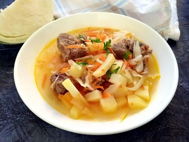 Обед в выходные дни у нас не обходится без первого блюда. В этот раз сварила суп из свежей капусты с мясом по этому рецепту.