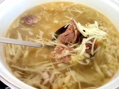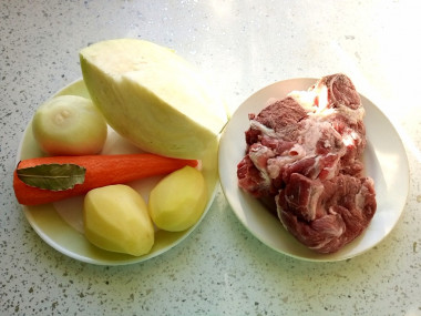 Варить бульон решила из говядины на кости. Это мясо варится долго, поэтому занялась им заранее, с утра. Варила сначала 15 минут, первый бульон слила, а затем два часа до готовности. Мясо нарезала на кусочки. Картошку и капусту заложила за пол часа до готовности мяса. Капуста у меня "зимняя", поэтому и варить её нужно дольше. После добавления зажарки проварила минут пять и дала настояться. Лавровый лист положила в кастрюлю вместе с луком и морковью, чтобы он не горчил.