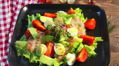 Представляем вашему вниманию яркий и аппетитный салат, который станет настоящей находкой для любителей свежих и вкусных блюд. Этот салат сочетает в себе сочность помидоров, нежность перепелиных яиц, хрустящий бекон и освежающие огурцы, все это на фоне свежих листьев салата. Заправка из оливкового масла и лимонного сока придает салату особую пикантность и легкость.