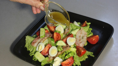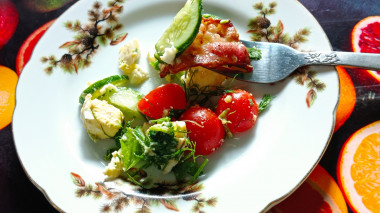 Лёгкий салат со свежими помидорами и огурцами, дополненным жареным беконом и отварными яйцами станет прекрасным полноценным ужином. Простой овощной салат подойдёт как для женского меню, так и для мужского. Меняя соус для заправки салата по своему вкусу, можно каждый раз открывать его с новой стороны.