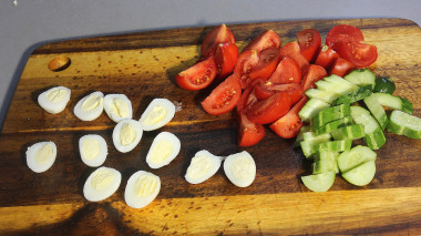 Готовила рецепт на четыре порции. Вместо восьми перепелиных яиц (хотя именно перепелиные яйца выглядели бы более эффектно в салате) я взяла четыре куриных, крупно их нарезала. Добавила листовой салат и ещё немного зелени укропа и петрушки. Огурцы у меня были небольшие, поэтому нарезала в салат три штуки. Бекон использовала сырокопченнный.