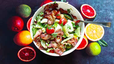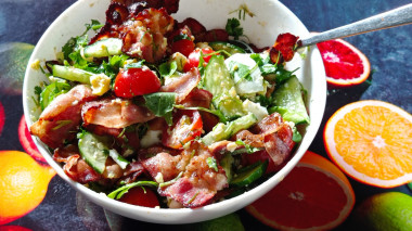 Этот салат заинтересовал меня прежде всего наличием жареного бекона и тем, как красиво в салате он выглядит.