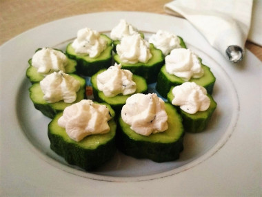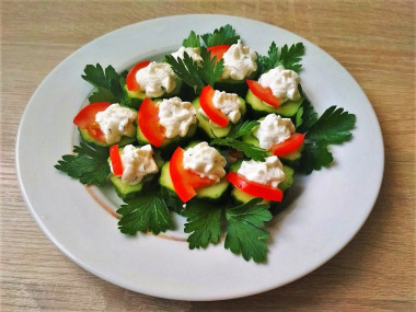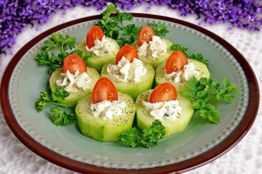 Закуска из огурцов и помидоров поразила меня простотой приготовления и своим вкусом. Не думала, что огурцы так хорошо сочетаются со сливочным сыром. Теперь буду угощать гостей такой вкуснятиной