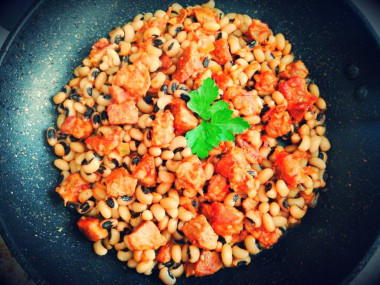 Тем временем порезала свинину небольшими кубиками и выложила кусочки в разогретое масло на сковороду. Жарила, пока мясо не подрумянилось. Затем добавила в сковороду порезанный кубиками лук, дождалась, когда он прожарится до золотистого цвета, и отправила в сковороду также порезанный кубиками помидор и мелко порубленный зубчик чеснока. Тушила мясо до готовности, пока оно не стало мягким. Затем переложила к мясу готовую фасоль, посолила, накрыла сковороду крышкой и тушила 5 минут. Дала 20 минут, чтобы блюдо настоялось.
