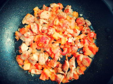 Нарезанный помидор отправьте в сковороду к мясу и перемешайте.
