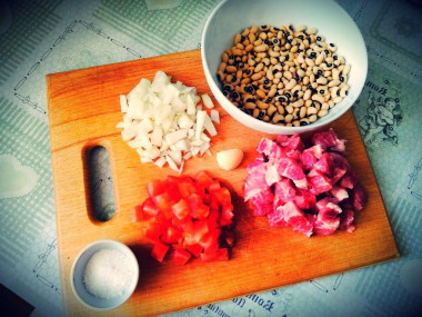 Готовила лобио из белой фасоли и свиной вырезки на 2 порции. Фасоль предварительно замочила в воде и оставила на всю ночь. Утром промыла, залила свежей водой и поставила варить фасоль на 1 час.