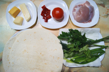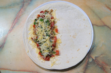 Тортилью не грела, она у меня была свежей и очень мягкой. Сыр использовала трех видов: российский, фермерский и пармезан. Посыпала тертый сыр под начинку и сверху начинки, чтобы он расплавился с двух сторон.