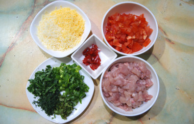 Как сделать кесадию с курицей и сыром в домашних условиях? Подготовьте продукты. Куриное мясо подойдет любое, у меня филе грудки. Сыр возьмите хорошо плавящийся, вкусный. Вместо острого перца можете взять обычный болгарский. А вместо (или вместе) зеленого лука — любую зелень. Хорошо подходит к кесадии кинза.