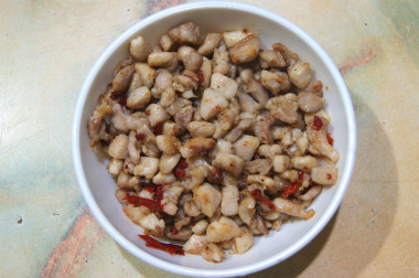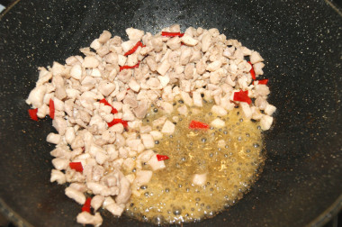 Сняла с огня как только мясо начало подрумяниваться. Как видно из фотографий, я жарила курицу вместе с острым перцем, использовала сковороду вок.