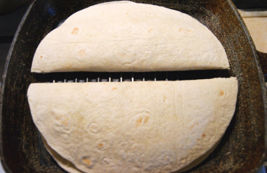 Обжарьте кесадии с обеих сторон на сухой сковороде, лучше если это будет сковорода-гриль. Сыр внутри должен будет расплавиться, а начинка прогреться.
