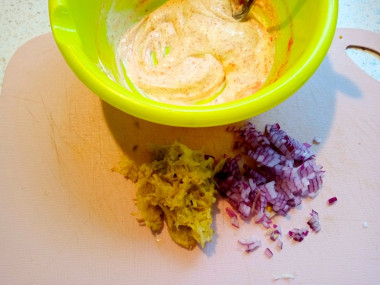 Также в качестве заправки можно использовать не только майонез, но и сметану или натуральный йогурт. Их можно взять по отдельности либо смешать с майонезом в любой пропорции на свой вкус - это снизит калорийность блюда.