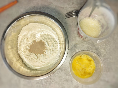 В миску с мукой влейте тёплую молочную смесь. Добавьте взбитое вилкой или венчиком яйцо. Яйцо заранее достаньте из холодильника, дайте ему нагреться до комнатной температуры. Можете ускорить процесс: подержите яйцо в тёплой воде 5 минут. Вода не должна быть горячей, чтобы не треснула скорлупа. Как правильно взбить яйцо, читайте в статье после рецепта.