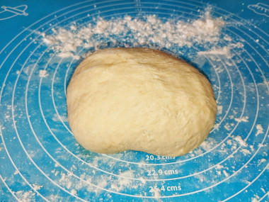 Теперь продолжите замес теста руками, по необходимости подсыпая муку, подгибая края к центру и слегка надавливая, около 10 минут, пока тесто не станет эластичным. Оно должно получиться мягкое и податливое, не тугое. Накройте готовое тесто пищевой плёнкой и оставьте в тёплом месте примерно на 1 час. Как только тесто поднимется примерно в 2 раза, слегка обомните его, и можете формировать пышки. Чем смазать выпечку и тесто читайте в статье под рецептом.