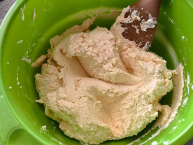Вбейте в творог яйцо и хорошо перемешайте. Для пачки творога в 200 г. отлично подойдет самое маленькое яйцо, например С2. Если у вас есть только крупные яйца, то добавьте только желток. При увеличении количества порций яйца добавляйте по одному, каждый раз перемешивая. Ориентируйтесь на консистенцию теста. Оно не должно быть слишком жидким. Точное количество яиц зависит от влажности творога и размера самих яиц.