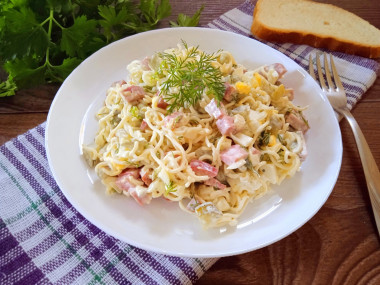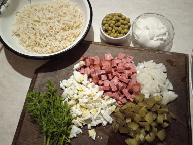 Салат с мивиной яйцами майонезом очень заинтересовал меня своими составляющими. Никогда ранее не готовила салат с вермишелью быстрого приготовления и решила попробовать. Как раз пачка мивины с курицей не острая лежала. Вместо куриного филе я добавила то, что было под рукой ) взяла сырокопченую колбаску. Правильно автор пишет "получается быстрее". Зелёный лук заменила репчатым и положила свежий укроп. Зелёный горошек я положила консервированный. Нарезала все ингредиенты кубиками. Смешала всё с запаренной лапшой. Соль не клала, я использовала пакетик приправы для лапши, когда заливала ее кипятком. Майонез брала 67%. Салат супер вкусный! Необычный, оригинальный и бюджетный. Очень напоминает оливье) Хрустящие огурчики вносят пикантности. Колбаска хорошо вписалась в салатик. Салат простой и быстрый в приготовлении, минут 15 и ужин готов! По вкусу мне очень понравился такой салат. Теперь он будет моей палочкой-выручалочкой. Пришел с работы, запарил мивину и добавил всё, что есть в холодильнике. Можно разнообразить салат и кукурузой, и петрушкой, и сыром, и сладким перцем, и сметаной заправить или даже маслом. Уже куча вариантов вкуснейшего ужина из мивины))) Огромное спасибо автору за новинку!!!