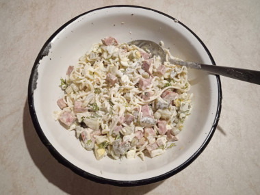 Мясо, куриные яйца и маринованные огурцы кладем в миску с приготовленной лапшой. Солим по вкусу. Если лапша распаривалась с добавлением специй, то соли добавлять не надо.