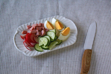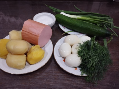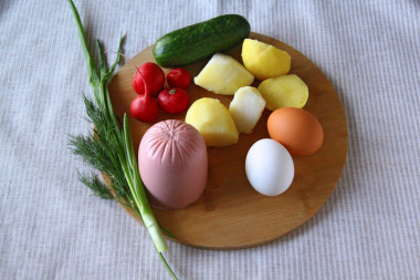 Как сделать классическую окрошку с колбасой? Подготовьте все необходимые продукты. Картофель надо предварительно отварить. Для этого хорошенько помойте его и неочищенным закиньте в кипящую воду, так в нем сохранятся витамины. Варите картофель 25 минут. Яйца отварите в течении 10 минут после закипания. Затем оставьте их остывать в той воде, в которой они варились. Так белок останется мягким, а желток ярким.