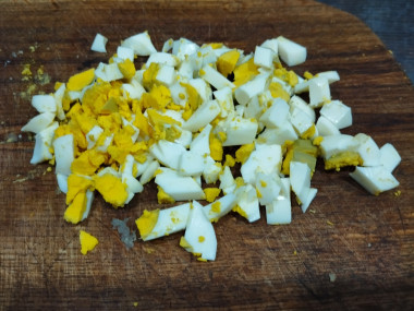 Яйца остудите, очистите и также порубите тонкой соломкой.