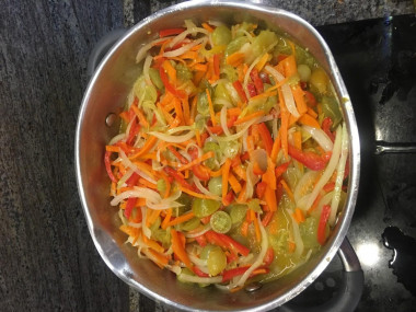 4. После того, как помидоры пустили достаточно сока, добавляем в кастрюлю нарезанные лук, морковь и болгарский перец. Туда же вливаем растительное масло (можно подсолнечное рафинированное или оливковое). Накрываем кастрюлю крышкой и тушим овощи еще около 15 минут.