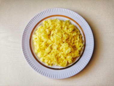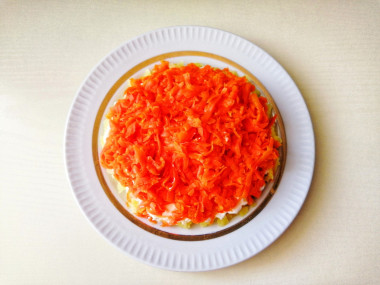 Вторым слоем салата будут желтки куриных яиц. Присыпьте тертыми желтками картофель. Майонезом смазывать их не нужно. Далее идет вареная морковь. Очистите и натрите ее также на терке. Выложите морковь на куриные желтки в тарелку, разравняйте ее и смажьте тонким слоем майонеза.