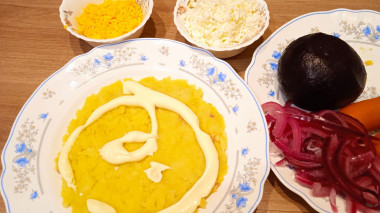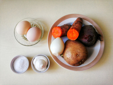 Подготовьте все необходимые ингредиенты. Картофель, морковь и свеклу вымойте и отварите в мундире. Готовность овощей проверьте острием ножа или вилкой, они должны легко входить в овощ. Воду, в которой варились овощи, слейте, дайте овощам остыть. Майонез для салата можно сделать самостоятельно, так будет вкуснее и полезнее. Под шагами вы найдете ссылку на каталог с рецептами домашнего майонеза.