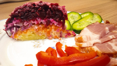 Отличный вариант привычной шубы. Майонезом я смазала только 2 слоя, морковный и верхний, салат немного постоял и хорошо пропитался. Мне он понравился в качестве гарнира к мясу. Удобно, пока тушится/печется, приготовить этот салат. Он получается сочный, вкусный, красочный за счет ярких овощей и, как контраст, белки и лук. Очередная полезная и вкусная находка на Хрумке. Думаю, для тех, кто соблюдает пост, рецепт очень пригодится, если заправить постным майонезом.