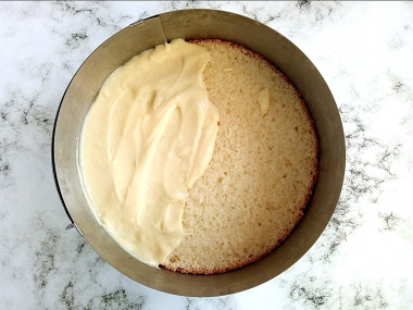 Выложите корж на блюдо, сверху распределите густой заварной крем. Я формировала торт в разъемной форме, чтобы крем не вытек.