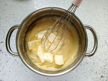 Уберите крем с огня, добавьте сливочное масло и перемешайте до однородности. По желанию можете добавить мягкое сливочное масло в полностью остывший крем и взбить миксером.
