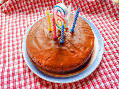 Пропитки лучше сделать в два раза больше, но это на мой вкус. Я люблю сильно пропитанные коржи. Коньяка у меня не было, ничем его не заменяла. Для глазури вместо темного шоколада использовала молочный, поскольку дочка не любит темный шоколад.