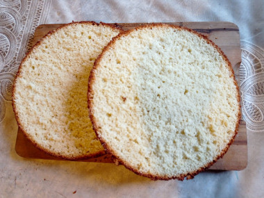 Тесто замешивала по рецепту, оно получилось текучим со множеством пузырьков. Воздушность достигается за счет хорошего взбивания яиц с сахаром. Выпекала бисквит в большой форме диаметром 24 см. Между дном и боками зажала силиконизированный пергамент, бока ничем не смазывала. Выпекала 35 минут при 180°С. Бисквит постоял 10 минут, затем силиконовой лопаткой легко отделила бока. Бисквит остудила на решетке, затем обернула пищевой пленкой и убрала в холодильник на 4 часа. После этого корж легко разрезался пополам и не крошился.