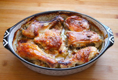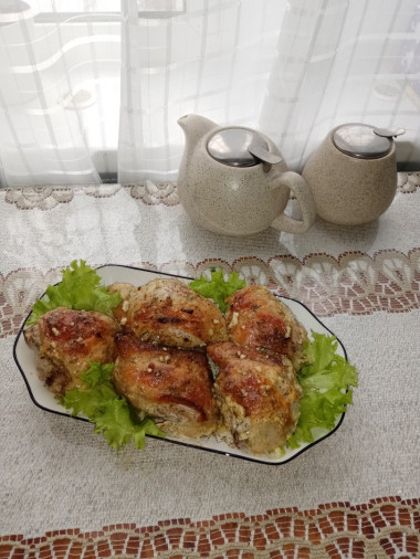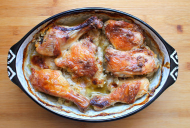 Изумительное блюдо вышло! У меня были бёдра и голени, запекала их вместе. Очень приветствую в подобных блюдах чеснок, поэтому его использовала тоже. Из сухих трав взяла базилик, смесь прованских, молотые перцы (в обязательном порядке душистый перчик), тимьян и майоран. Так как запекать планировала в глубокой форме и курицу выкладывать в два слоя, то предположила, что образуется изумительный чесночно- сметанный соус, а поэтому решила от себя добавить немного мелко нарезанного лука.