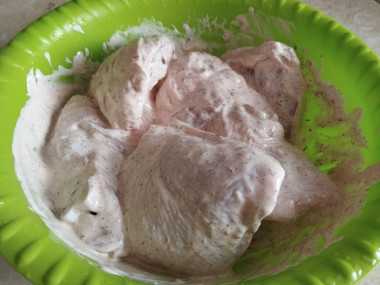 Теперь выложите куриные бедра в получившийся сметанный маринад. Убедитесь, что они покрыты маринадом со всех сторон. Хорошо перемешайте курицу, как будто массируя её. Оставьте бедра мариноваться на один час или более в холодильнике. Примерно за полчаса до начала запекания включите духовку на 200 градусов.