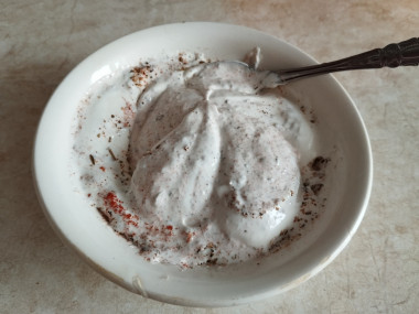 Затем выложите сметану в глубокую посуду и добавьте к ней соль, пряные травы и специи по вашему вкусу. Я использовала сушеный чеснок, базилик, приправа для курицы. Перемешайте всё тщательно.