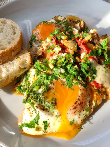 Белки схватились, желток немного подрагивает - наш любимый вариант Шакшуки! Завтрак готов.