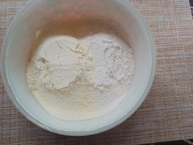 В глубокую миску просейте пшеничную и кукурузную муку. Все тонкости работы с пшеничной мукой и добавления к ней других видов муки вы узнаете прочитав отдельные статьи на эти темы. Ссылки на них есть в конце рецепта.