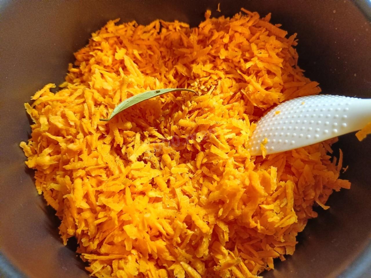Отправьте в чашу мультиварки измельчённую морковь. Посолите, поперчите по вкусу, добавьте лавровый листик. Всё хорошо перемешайте. Включите режим "Тушение", выставьте таймер на 40-60 минут и закройте крышку.