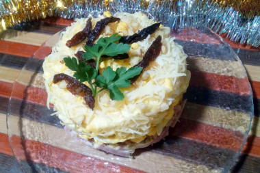 Последний слой натёртые на мелкой тёрке яичные желтки.