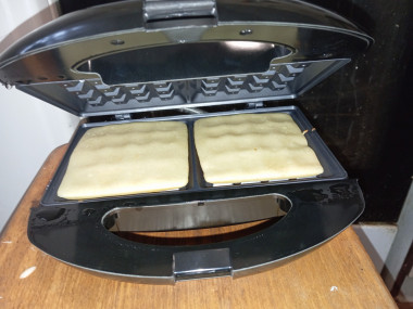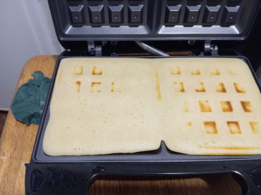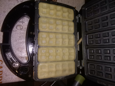 Разогрейте вафельницу. У меня мультипекарь, когда загорелся зелёный свет - готов к работе. Ориентируйтесь на работу своей техники.