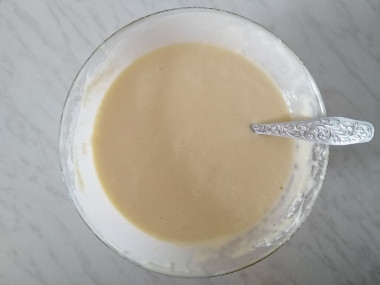 Влейте 200 мл кефира комнатной температуры и снова перемешайте до однородности.