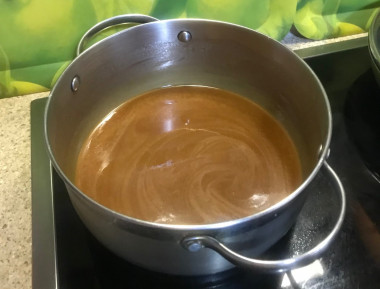 Только что приготовленная карамель очень жидкая, но после ночи в холодильнике она загустеет. Сверху масса будет немного гуще, поэтому после отстаивания в холодильнике её необходимо перемешать. При перемешивании карамель станет однородной.
