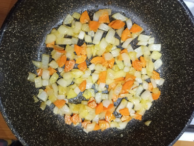 Морковь очистите ножом или овощечисткой, вымойте в проточной воде, обсушите бумажным полотенцем и натрите на крупной или средней терке. Чеснок и лук очистите, промойте и обсушите, нарежьте кубиком. Промойте лук и нож холодной водой, что защитит глаза от слёз. А чтобы доска не впитала запах, натрите её лимоном. В кастрюле с толстым дном или сотейнике разогрейте растительное масло и обжарьте овощи на среднем огне, помешивая лопаткой, чтобы не подгорели.