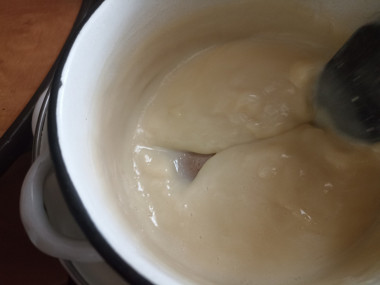 Крем должен заметно загустеть. Время томления крема на водяной бане зависит от жирности и густоты сметаны. Чем больше жирность сметаны, тем быстрее крем станет густым. Проверить готовность крема можно легок, достаточно провести ложкой по центру до дна кастрюли, и если крем сразу не затекает в желобок, значит он готов.