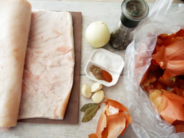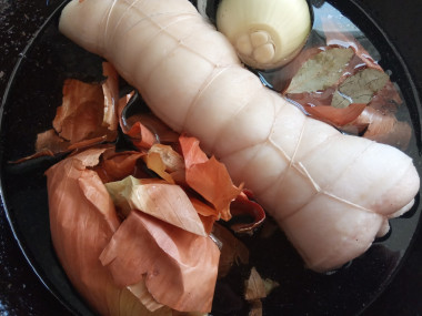 В сковороду среднего размера (ориентируйтесь на размер свиного рулета) налить чистой воды. Репчатый лук очистить от шелухи, промыть и положить в кастрюлю с водой. Туда же бросить луковую шелуху, оставшуюся соль, сухие специи, перец горошком и лавровый лист. Осторожно, чтобы не распустился, опускаем в кастрюлю свернутую в рулет свиную шкурку. Затем ставим кастрюлю на плиту и на среднем огне доводим воду до кипения. Далее уменьшаем огонь до минимального и варим рулет под крышкой на протяжении 2 часов.