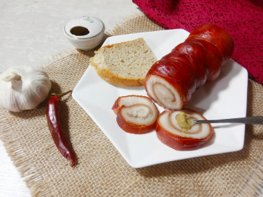 Если после разделки свинины осталось тонкое сало, лучше всего приготовить рулет из шкурки сала. Кусочек шкурки у меня был небольшой, поэтому после отваривания я не стала включать духовку, а отправила рулет на 10 минут в микроволновку в режиме "гриль". Вкусная, сытная , красивая закуска получается. С домашней, ядреной горчицей- огонь! Спасибо, ZHANNA!