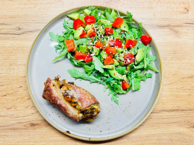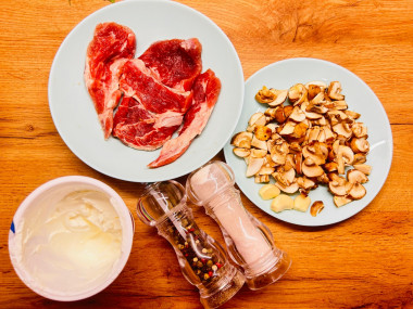 Из частей свинины у меня была шея. Сметаной по итогу я смазывать не стала, взяла лишь майонез. Грибы обжарила не с луком, а с чесночком. И вообще я решила сделать их очень большого размера, чтоб не возиться долго) Готовила я их в аэрогриле, на это ушло у меня ровно 20 минут, за это время успела нафантазировать салат из того, что было в холодильнике.
